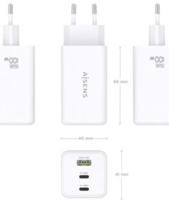 AISENS – CARGADOR GaN 100W, 2xUSB-C PD3.0 QC4.0 QC5.0, 1xUSB-A QC3.0, BLANCO