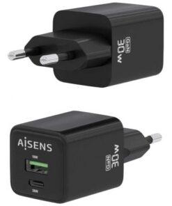 AISENS – CARGADOR GaN 30W, 1xUSB-C PD3.0 QC4.0, 1xUSB-A QC3.0, NEGRO