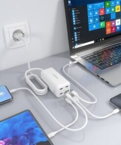 Cargador de sobremesa GaN USB-C de 100W. Carga rápidamente portátiles, móviles, tablets, cámaras u otros dispositivos. Su diseño de sobremesa ofrece un acceso cómodo y rápido a los puertos USB.