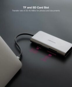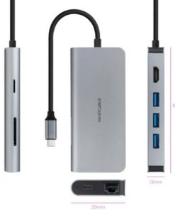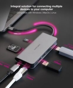 USB-C 8 en 1, USB-C 3.1 a 3 USB-A 3.0 + HDMI 4K a 60 Hz + USB-C PD + RJ45 1 Gbps + TF + SD, aluminio, gris, 18 cm