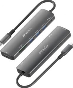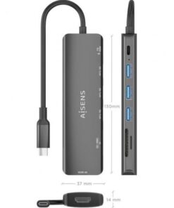 AISENS – USB-C DOCK 7 EN 1, USB-C A 1xHDMI, 3xUSB-A, 1xUSB-C PD 100W, 1xSD, 1xMICRO SD, GRIS, 15CM