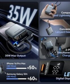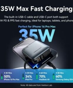 - Salida (cable USB-C integrado): 5V⎓3A; 9V⎓3A; 12V⎓2.5A; 15V⎓2.33A; PPS: 3.3~11V, 3.18A (35W Máx)